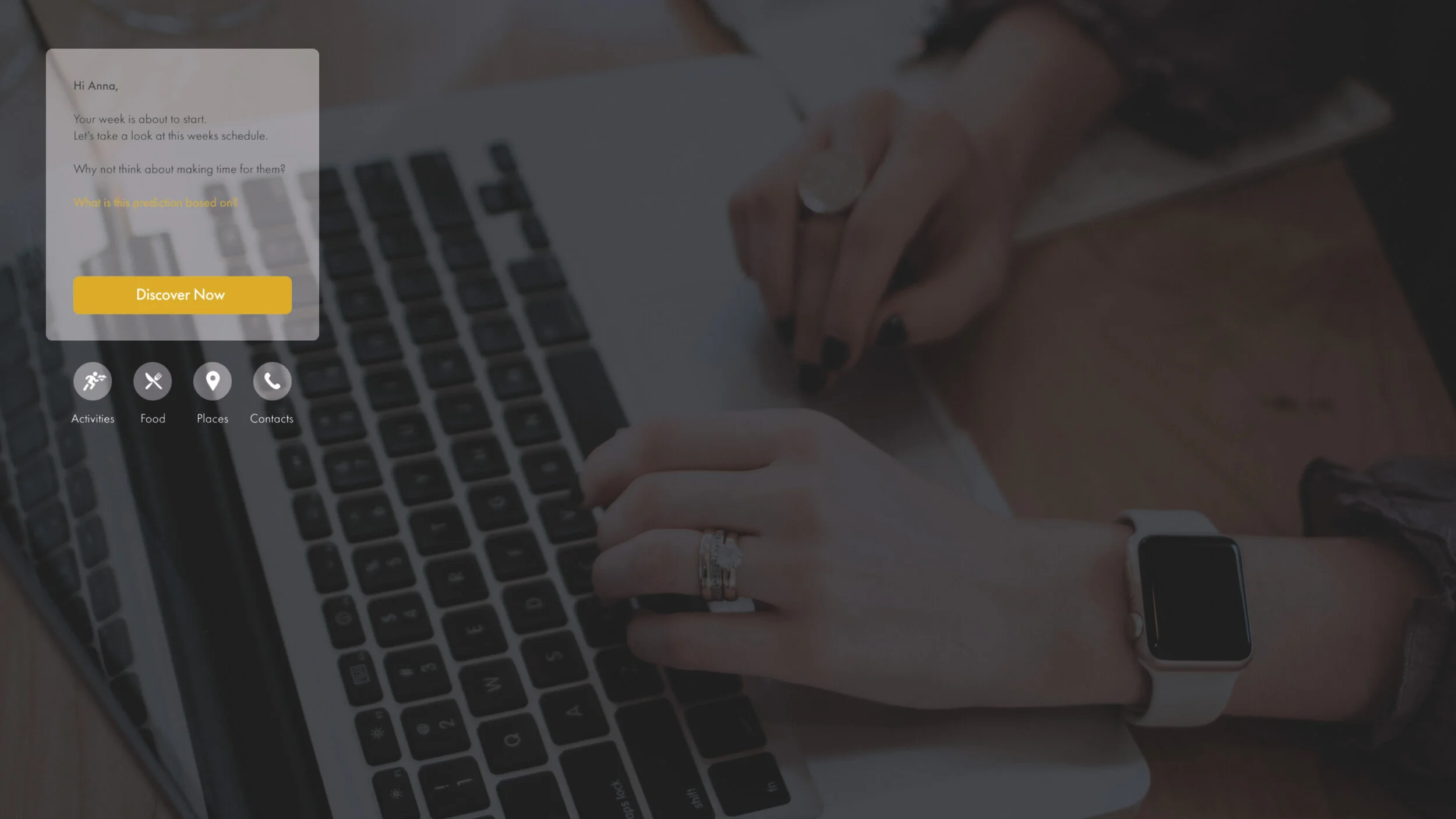 Create a personal assistant (PA), that attempts not to let tech go between the user and other people (e.g. plans events for many parties), but tries to focus on an individual and their well-being. The ideal would be to create the PA as a secluded system that does not sell or provide the data to third parties. Aim is to let users make their own choices, where technology doesn’t force suggestions on them, but lets them discover opportunities. Priority is to provide full transparency about what data tracking results are, when and where the PA is using them.